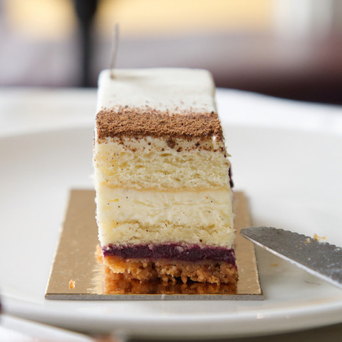 There’s the vanilla cassis cake with vanilla mascarpone, sablé breton, cassis ganache, and soft chiffon cake — the almond croissant topped with slivered almonds and dusted with powdered sugar and cocoa powder — the elegant verrine, with its layers of raspberry, peach, and custard served a small glass cup.